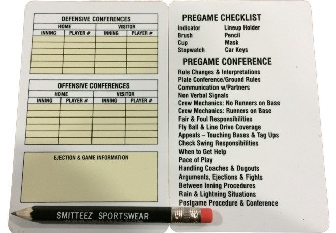 Baseball Umpire Reusable Plastic Game Card W/ Pencil -Includes: Pregame Checklist, Pregame Conference Information, Defensive & Offensive Conferences, As Well As, An Area For Ejections And Game Information.