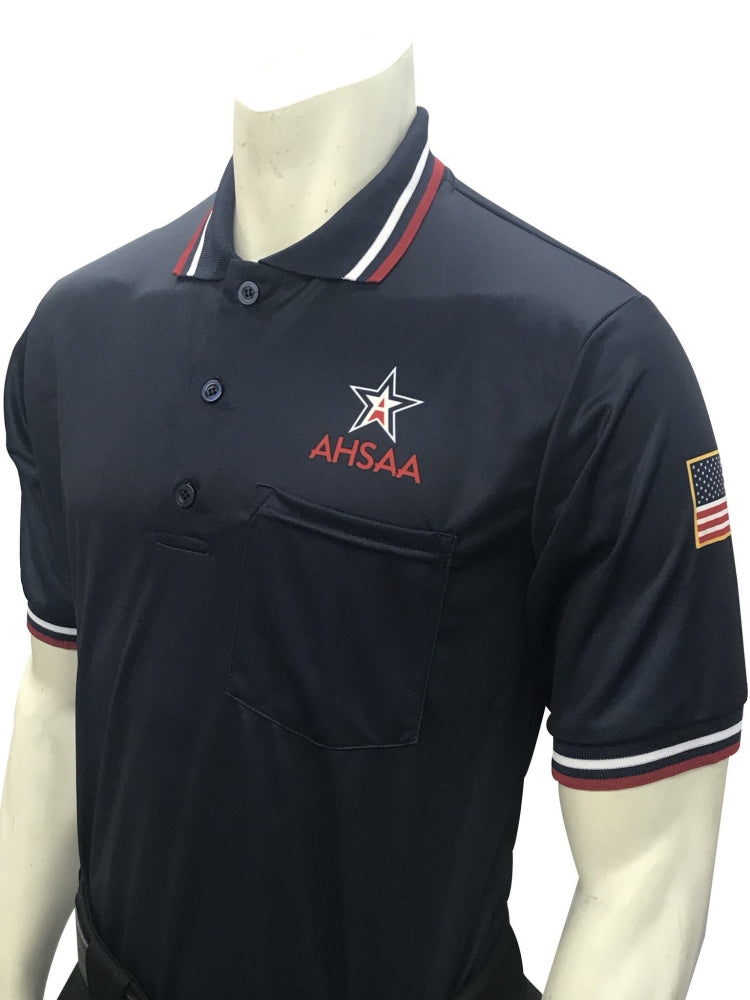 Smitty AHSAA Umpire Shirts -Alabama High School Athletic Association Logo Is Seamlessly Dyed Into The Shirt On The Left Chest Above The Pocket. U.S. Flag Is Dyed Directly Into The Fabric On The Left Sleeve. The Ultra Mesh ComfortTech Moisture Wicking Fabric Breathes To Help Keep You Cool. Left Chest Pocket And Hems With Three Button Placket. Extra Tuck-In Length Split Tail Bottom. Sized For The Plate, No Need to Size Up.